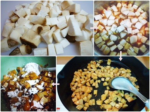 杏鮑菇4條、麵腸1條、胡椒、醬油膏、太白粉、香油、五香粉