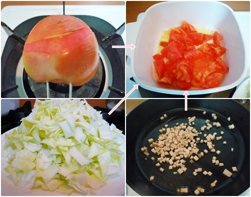 蕃茄一顆、高麗菜幾葉、素火腿丁一小碗、糖鹽少許、蕃茄醬適量。