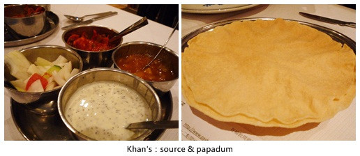 roti Papadum很薄容易碎,服務生不知道是跟我們玩還是真的這樣吃,叫我們放在盤子上,用湯匙的背面把roti Papadum像敲磚塊一樣,一一敲碎,Debbie照作一次後,發現力道有點難控制,碎片會飛出盤外,後來我們改用撥的。左邊的那四小碗是搭配的醬料,優格醬超酸,糖漬芒果醬超甜,紅色忘記叫什麼名字的醬超鹹,洋蔥丁看起來很正常,但因為我和男主人都不吃,Debbie好像也沒興趣,就擱在那。