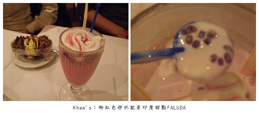 網路上寫FALUDA融合新鮮水果、西米露及冰淇淋,結果送來我們還以為是草莓奶昔加青蛙蛋,味道更妙,粉紅色大概是色素香料作出來的效果,除了甜想不出其他形容詞。雖然有點失望,但這兩道甜點讓我們的用餐過程增加不少歡笑,因為我仗著旁邊沒人聽得懂中文,一直嚷「被騙了!被騙了!」
