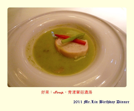 青豆湯裡有加松露油,喜歡蕈味的人會很愛!男主人討厭菇味,一口都不肯喝...