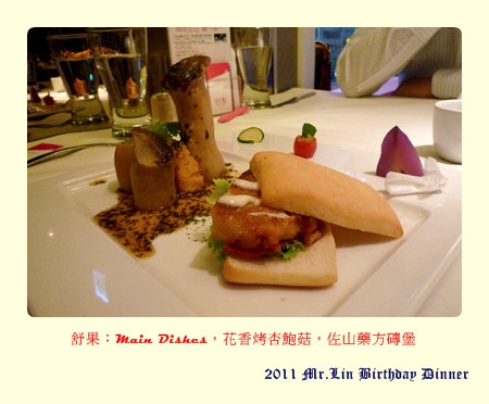 杏鮑菇有種特殊的香味,很好吃!照片右方的紫色配菜很特別,大家研究好久,猜半天不知道是什麼,後來請服務生解答才知道是糖煮某種梨。