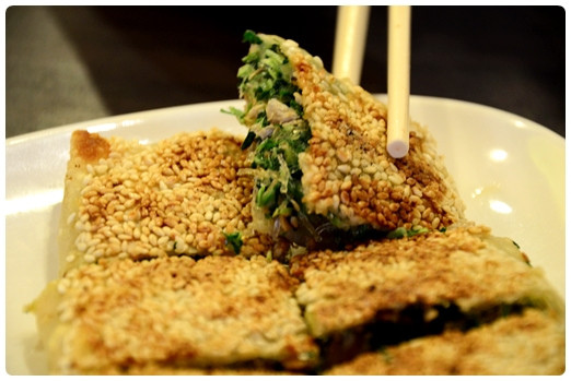 第三道是椒鹽鍋餅,這是我們兩票選的美味第一名。豆皮、香菇、青江菜和冬粉組合而成的餡料,跟灑滿白芝麻的酥脆餅皮,一口咬下香氣十足。