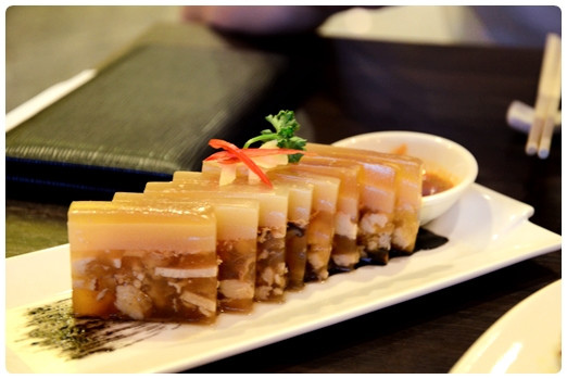 江蘇名菜的鎮江肴肉是一種利用動物膠質作成的肉凍。素食可以產生凍感的材料,常見不外洋菜、吉利T和蒟蒻果凍粉,這三種口感一個比較脆(洋菜),一個比較軟(吉利T),另一個比較Q彈(蒟蒻果凍粉,跟蒟蒻粉不一樣),照食材特性要拿來作鹹凍還要站得挺又不易碎不簡單,而且最上方還加了一層蒟蒻,咬起來的口感更加豐富,設計這道菜的師傅很厲害!