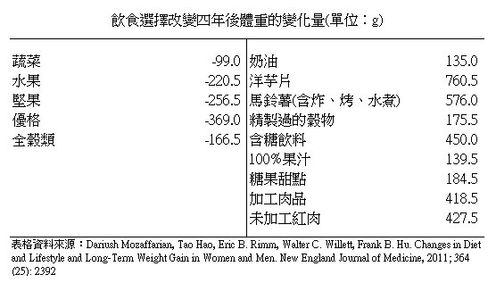 Dariush Mozaffarian, Tao Hao, Eric B. Rimm, Walter C. Willett, Frank B. Hu. Changes in Diet and Lifestyle and Long-Term Weight Gain in Women and Men. New England Journal of Medicine, 2011; 364 (25): 2392 摘要在這裡,全文PDF檔在這裡,附件需上NEJM的網站用帳號下載。