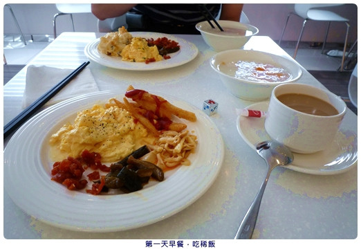 第一天的早餐,吃地瓜稀飯配醬菜,外加薯條西式炒蛋和咖啡