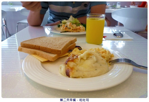 第二天吃起士蛋吐司,外加焗烤馬鈴薯泥,配柳橙汁