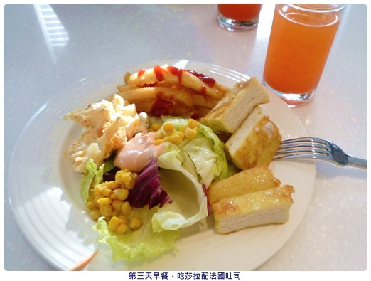 第三天吃馬鈴薯沙拉配超新鮮的結球萵苣,外加薯條和法國吐司,喝葡萄柚汁